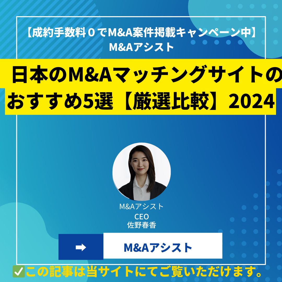 「M&Aアシスト」がお手伝い。「M&Aアシスト」は希望の条件であなたのM&Aを発信できます。チャット機能も利用可能。M&A支援士とM&Aアシス全国フランチャイズの展開も行っております。ご利用お待ちしております。「M&Aアシスト」はM&Aを成功させたいをかなえるマーケットプレイス👩🦰